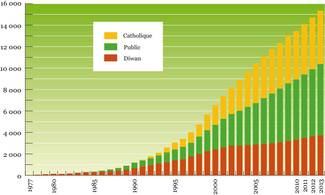 Les effectifs sont en croissance continue, pour la 36ème année consécutive : +4,3% cette année. 9 nouveaux sites ont ouvert dans le 1er degré, 1 dans le 2nd degré.